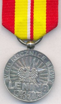 Badge: silver medal. Obverse: an uncrowned Polish eagle with a five-pointed star behind, and the words "LENINO / 1943 - 2003" in the lower part. The upper part is surrounded by the inscription "W 60 ROCZNICE BITWY" (on the 60th anniversary of the battle). Reverse: a three line inscription "ZWIAZEK ZOLNIERZY / LUDOWEGO WOJSKA POLSKIEGO / DOLNY SLASK".