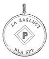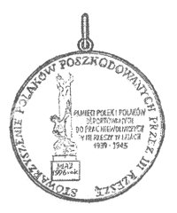 Badge: gold or silver medal, 60 mm in diameter. Obverse: a square with the letter P inside, as worn by the poles in the area of the Third Reich, with the words ZA ZASLUGI (for merit) above and DLA SPP (to SPP) below. Reverse: a picture of a monument showing a human figure with a tree in the background; on the right there is a five line liscription PAMIECI POLEK I POLAKOW / DEPORTOWANYCH / DO PRAC NIEWOLNICZYCH / W III RZESZY W LATACH / 1939-1945 (to the memory of the Polishmwomen and Polishmen deported to slave work in the Third Reich in 1939-1945); the whole being circumscribed STOWARZYSZENIE POLAKOW POSZKODOWANYCH PRZEZ III RZESZE.