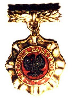 Badge: golden, silver or bronze eight pointed star, 23 mm in diameter, each arm in the form of a trefoil, joined by white enameled devices in the form of a lily. The obverse of the central medallion depicts an uncrowned silver eagle on red background, surrounded by a red ring circumscribed NAGRODA PANSTWOWA (national prize) and the Roman numeral I, II or III depending on the class. The medallion reverse bore the letters PRL circumscribed NAUKA SZTUKA : TECHNIKA (science, arts, technology).