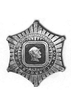 Badge: gold or silver six-pointed star, 36 mm in diameter. In the square central medallion there is the head of a miner, seen from the right profile, on red bckground. The red ring bears the inscription RACJONALIZATOROM : PRODUKCJI (to rationalizers of production).
