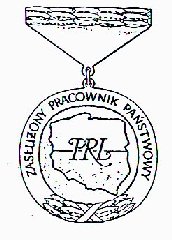 "Meritorious State Worker" badge 1974-90: round gilt medal, 33 mm of diameter, Obverse: a contour of Poland, enameled white and red, with the letters PRL in the center, surrounded by an open laurel wreath of 10 highly stylized leaves. Reverse: a four line inscription ZASLUZONY / PRACOWNIK / PANSTWOWY / PRL.