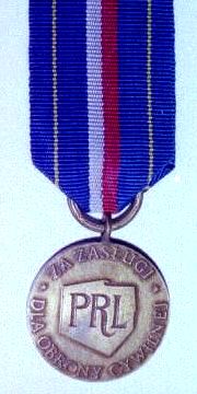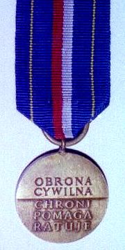 Badge: round medal, 30 mm of diameter. Obverse: symbolic contour of Poland with the letters PRL inside, circumscribed ZA ZASLUGI : DLA OBRONY CYWILNEJ (for merit to Civil Defense). Reverse: a five line inscription: OBRONA / CYWILNA / CHRONI / POMAGA / RATUJE (civil defense protects, assists, rescues).