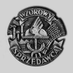 Badge: round plaque, 30 mm in diameter, depicting the winged hat of god Hermes with a factory and conr spike in the background. There is a scroll inscribed WZOROWY (exemplary) at the top, and another one inscribed SPRZEDAWCA (clerk) at the bottom. The reverse has a mounting pin or screw.