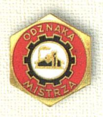 Badge: golden hexagonal plaque, 25 mm in diameter. In the center there is a red circular shield with a black enameled gearwheel with a picture of a factory on white background inside. There is the inscription ODZNAKA : MISTRZA above and below the gearwheel. The reverse has a mounting pin or screw.