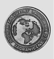 Badge: round bronze plaque, 20 mm in diameter, depicting the globe with the seas covered with dark blue enamel. The surrounding nonenemeled ring bears the inscription ZASLUZONY PRACOWNIK : HANDLU ZAGRANICZNEGO. The reverse has a mounting screw.