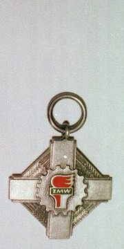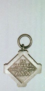 Badge: silver Greek cross, 33 x 33 mm with corn spikes betwen the arms. In the center there is a gearwheel with a stylized torch - the emblem of the Association inside. The reverse bears the inscription ZA / ZASLUGI / DLA / ZMW and two laurel sprays on the sides.