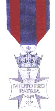 Badge: blue enameled massive Leopold cross without ball finials, with a silver Polish eagle superimposed on the center of the cross. The reverse is non-enameled, and bears the Latin motto of the order: "MILITO / PRO / PATRIA" (I fight for homeland), with the year of institution "MMVI" in Roman numerals and the number of award below. Placed along the vertical arms is also the coronation sword of Polish kings. The cross in all classes is surmounted by a crown, similar to the one surmounting the Polish eagle. Metal parts are gilt in the class of GC and silver in the remaining two classes.