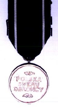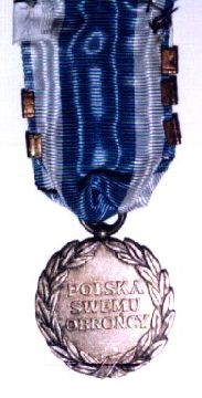 Badge: bronze medal 36 mm of diameter. Obverse: a crowned eagle sitting on a sable. Reverse: the inscription POLSKA / SWEMU / OBRONCY (Poland to Her defender) and a small oak leaf above and below.