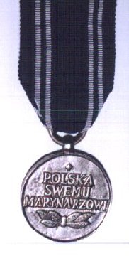 Badge: silver medal 36 mm of diameter. Obverse: a shield with the Polish crowned eagle superimposed on an anchor; all in a laurel wreath. Reverse: the inscription POLSKA / SWEMU / MARYNARZOWI (Poland to Her mariner) with a small lozenge above and a laurel leaf spray below.
