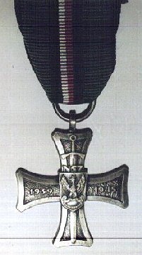 Badge: silver Greek cross, 42 x 42, similar to the Independence Cross. Obverse: the years 1918 and 1921 on the upper and lower arms respectively; and the inscription OBRONCY : OJCZYZNY (to a Country defender) through the horizontal ones. The square central medallion is enameled white and bears a crowned eagle. Reverse: plain.