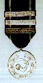 Ribbon: 37 mm navy blue with narrow white side stripes. Each