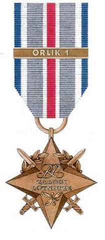 Ribbon: 35 mm, steel gray with a red central stripe, flanked by narrower white stripes and with white and NATO blue edge stripes . Participation in the "Orlik" operations is denoted by bronze bars inscribed "ORLIK 1", "ORLIK 2", "ORLIK 3" or "ORLIK 4".