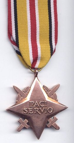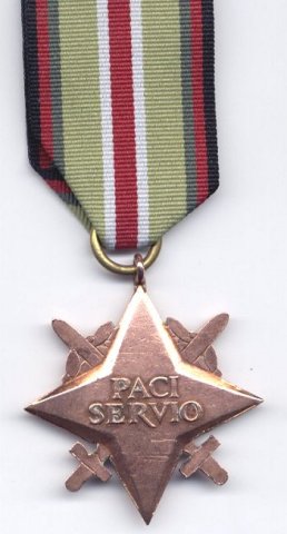Badge: four pointed bronze star, 44 x 44 mm. Crossed swords are placed between the arms of the cross, while laurel sprays are located between the upper and the horizontal arms. On the obverse there is a cipher "RP" (Rzeczpospolita Polska - Republic of Poland), the name "MORZE / SRODZIEMNE" (Mediterranean Sea) and three laurel leaves below. The reverse bears a Latin inscription "PACI / SERVIO" (I serve peace).