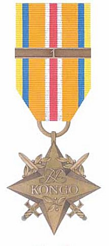 Ribbon: 35 mm, gold yellow with a red central stripe, flanked by narrower white stripes and with blue and yellow edge stripes (national colors of the Democratic Republic of Congo). Participation in each contingent or operation is denoted by a bronze bar with a contingent number in Arabic numerals. The numerals alone are also placed on the ribbon bar.