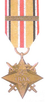 Ribbon: 35 mm, sand yellow with a red central stripe, flanked by narrower white stripes and with edge stripes in the Iraqi tricolor. Participation in each contingent or operation is denoted by a bronze bar with a contingent number in Arabic numerals. The numerals alone are also placed on the ribbon bar. Soldiers participating in the "Iraqi Freedom" operation are entitled to a bar inscribed "IRACKA WOLNOSC".