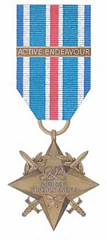 Ribbon: 35 mm, sea green with a red central stripe, flanked by narrower white stripes and with white and NATO blue edge stripes . Participation in the "Active Endeavor" operation is denoted by a bronze bar inscribed "ACTIVE ENDAVOUR".