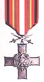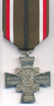 The cross, 42 x 42 mm is made in a silver metal and has rounded arm bases. In the middle of the obverse there is a crowned Polish eagle (there existed early copies without an eagle) surrounded by a ring of barbed wire; the arms bear the following inscription RP / ZA : WOLNOSC I : NIEPODLEGLOSC (Polish Republic for freedom and independence) : 1. IX / 1939. The reverse is blank. Crossed swords were initially attached to the ribbon; in the Polish made copies the swords are a link between the cross and ribbon.