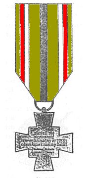 Ribbon: 37 mm, light green, with a black central stripe and white (inner) and red side stripes. Identical to that of the Peasant Battalions Cross.