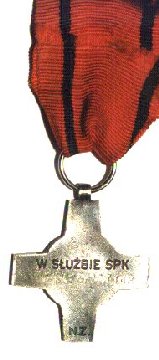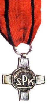 Badge: oxidized silver cross with plain diminishing arms. Medallion: stylized letters SPK, with a sword below and a corn spike above. The reverse is plain, except the inscription W SLUZBIE SPK (in service of SPK) across the horizontal arms.
