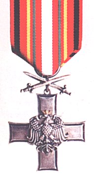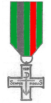 Badge: a Greek cross of oxydized silver metal, 44 x 44 mm, with a rand along the arm edges. The upper and lower arms bear the years 1939 and 1989 respectively. In the center there is a crowned eagle sitting on the Amazon shield, as worn on military headgears, surrounded by a barbed wire. The reverse is plain. There is a variant of the cross covered with black enamel. Crossed silver swords are worn above the cross.