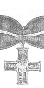 Badge: silver Greek cross, 42 x 42 mm, similar to the Order of the Grunwald Cross. A stylized silver eagle with a gilt crown is superimposed on the center. The reverse is blank. The cross is attached to the ribbon with a link of two silver crossed swords.