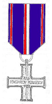 Ribbon: 40 mm, dark blue with narrow red side stripes (similar to that of the the Great Poland Uprising Cross) and with a white and red stripe through the center.