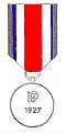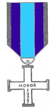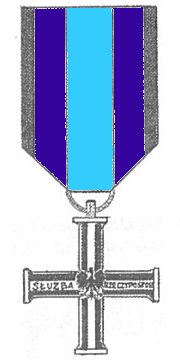 Badge: black enameled silver Grek cross, 42 x 42 mm, almost identical to the Independence Cross. In the center there is a crowned eagle, and the horizontal arms bear the inscription SLUZBA : RZECZYPOSPOLITEJ (service to Republic). The reverse has the word HONOR across the horizontal arms and the year 1927 on the lower one.