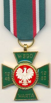 Badge: gold, silver or bronze cross pattée, 45 x 45 mm, with green enameed arms and the following inscription on them: WSGO (upper), 19 / 45 (left), 19 / 89 (right), WARTA (lower). Medallion: crowned white eagle on red bacground, surrounded by a closed laurel wreath. The reverse is plain, except the award number.