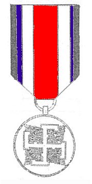 Ribbon: of five alternate stripes, three red and two white (identical with that of the Victory and Freedom Medal).