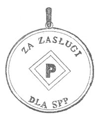 Badge: gold or silver medal, 60 mm in diameter. Obverse: a square with the letter P inside, as worn by the poles in the area of the Third Reich, with the words ZA ZASLUGI (for merit) above and DLA SPP (to SPP) below. Reverse: a picture of a monument showing a human figure with a tree in the background; on the right there is a five line liscription PAMIECI POLEK I POLAKOW / DEPORTOWANYCH / DO PRAC NIEWOLNICZYCH / W III RZESZY W LATACH / 1939-1945 (to the memory of the Polishmwomen and Polishmen deported to slave work in the Third Reich in 1939-1945); the whole being circumscribed STOWARZYSZENIE POLAKOW POSZKODOWANYCH PRZEZ III RZESZE.