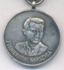 Badge: silver medal, 36 mm in diameter. Obverse: bust of Capt. Warszyc with the insctiption ZOLNIERZOWI WARSZYCA (to the soldier of Warszyc) below. Reverse: the anchor of Polish Resistance, circumscribed KONSPIRACYJNE WOJSKO POLSKIE : 1945-1956.