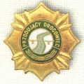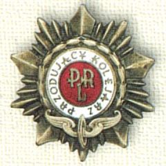 Badge 1954-90: gold or silver 10-pointed star, 36 mm in diameter, of five single plain arms, and five rays between each two arms. The central medallion bears the letters PRL on red background, surrounded by a white ring inscribed PRZODUJACY KOLEJARZ, surrounded in turn by a narrow laurel wreath; at the bottom of the medallion there is a silver winged wheel of the Polish National Railroads. The badge is mounted with a screw to the left breast pocket of the uniform.