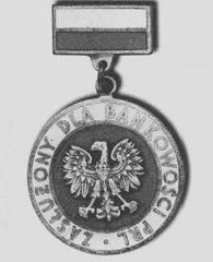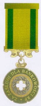 Instituted by the Government on October 23, 1983 as the Meritorious to Banking Services Decoration (Odznaka "Zasluzony dla Bankowosci"). Conferred in a single class to bank workers for long and efficient service. Discontinued ca. 1990 and renewed in an altered form by Government regulation of February 7, 2003.