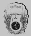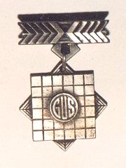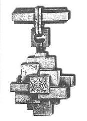 Badge 1971:28 x 28 mm. Obverse: of several rectangles of various shape, the central one bears the the image of the Polish uncrowned eagle. Reverse: a triangle surrounded by the inscription ZASLUZONY DLA : BUDOWNICTWA I : PRZEMYSLU / MATERIALOW /BUDOWLANYCH, with a small laurel twig below.