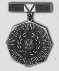 Badge: octagonal plaque, 32 mm in diameter. In the center of the obverse there is a red shield with a silver uncrowned eagle, surrounded by a laurel wreath; the whole being curcumscribed ZASLUZONY DLA : UEZPIECZEN SPOLECZNYCH. The reverse bears a six-line inscription MINISTERSTWO / PRACY I SPRAW / SOCJALNYCH / ZAKLAD / UBEZPIECZEN / SPOLECZNYCH (Ministry of Labor and Social Welfare, Social Welfare Bureau).