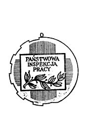 Badge 1988: bronze medal in the form of a gearwheel, 34 mm in diameter. The obverse depicts a silver eagle surrounded by a ring inscribed ZA ZASLUGI DLA OCHRONY PRACY. There is a wheat spike surrounding the left side of the ring. The reverse bears a rectangular tablet with a three-line inscription PANSTWOWA / INSPEKCJA / PRACY (State Labor Inspectorate) with a laurel spray below.