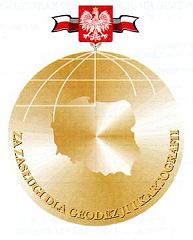 Badge 1999: gold medal, 30 mm, with a globe graticule in the upper half. In the center there is an outline map of Poland circumscribed ZA ZASLUGI DLA GEODEZJI I KARTOGRAFII below. The reverse is blank.
