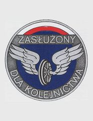 Badge since 2000: round silver plaque, 32 mm in diameter. It depicts a stylized silver leaf spring on blue background - the symbol of Polish railroads. Above, there is a bar inscribed ZASLUZONY (meritorious). The whole is encircled by a silver ring with white and red scroll in the upper part and the words DLA KOLEJNICTWA (to railroads) in the lower. The badge is mounted with a screw to the right breast pocket of the uniform.