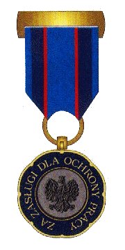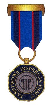 Badge 2004: a gilt rosette, 32 mm of diameter. Obverse: a silver crowned eagle on silver background, surrounded by a dark blue enameled ring, inscribed "ZA ZASLUGI DLA OCHRONY PRACY". Reverse: the logo of the National Labor Inspectorate, surrounded by a ring, inscribed "PANSTWOWA INSPEKCJA PRACY" on dark blue enamel.